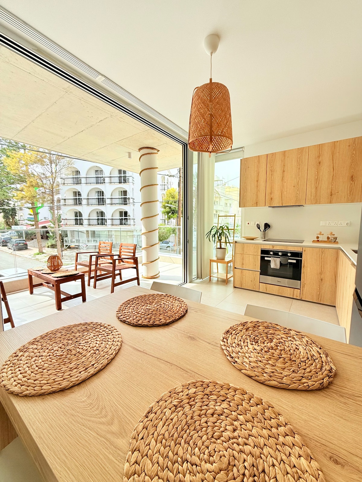 Rozkoszuj się stylowym pobytem w tym nowoczesnym apartamencie położonym zaledwie 3 minuty od plaży Finikoudes. Apartament ma jasny salon na otwartym planie, w pełni wyposażoną kuchnię, jadalnię, szybkie Wi-Fi, klimatyzację i telewizor Smart TV. Wygodna sofa łatwo przekształca się w łóżko 160x200, dzięki czemu w przestrzeni mogą się zatrzymać dodatkowi goście. Starannie zaprojektowane z ciepłymi i przytulnymi akcentami mieszkanie oferuje relaksującą atmosferę, a jednocześnie znajduje się blisko plaż, restauracji, kawiarni i sklepów.