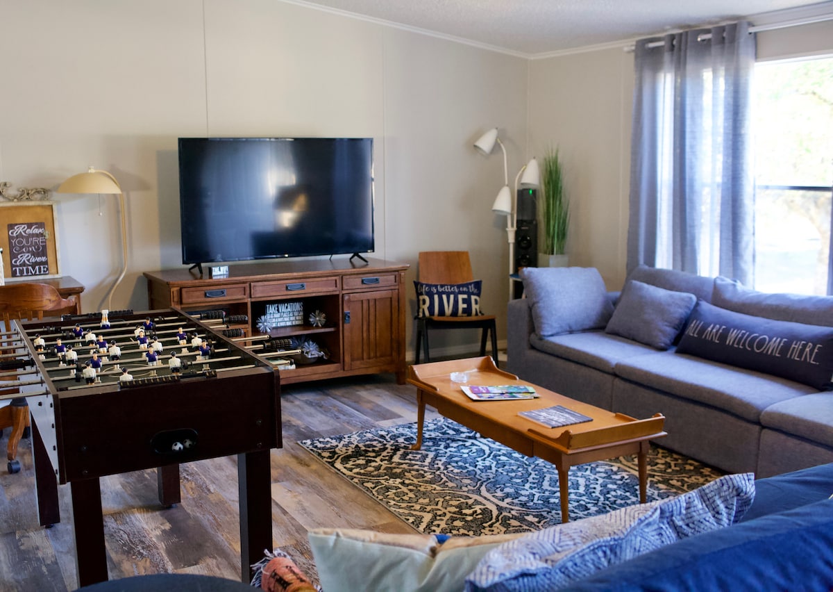 Niesamowita przestrzeń dla znajomych i rodziny. Ponad 1/2 akra; dzika przyroda. Przednie i tylne tarasy, wanna z hydromasażem, stoły piknikowe, grill na węgiel drzewny i kominek. Niesamowite ciemne niebo do obserwacji gwiazd. Piłkarzyki, telewizory 58” i 32” z funkcją streamingu, kącik dla dzieci, spacer do Wildflour Artisan Bakery & Grill i sklepu monopolowego. Kilka minut do Guadalupe, Canyon Lake Dam i Whitewater Amphitheater. Łatwe dojazdy do New Braunfels, San Marcos, San Antonio, Blanco, Wimberley i Hill Country! Odnowiony stary dom