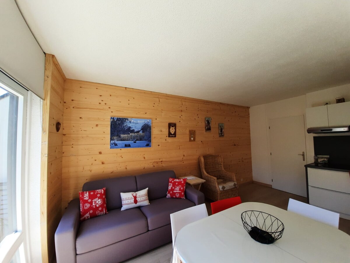 Studio o powierzchni 25 m2, z małą sypialnią (okno wychodzące na korytarz), balkonem skierowanym na południe, z widokiem na góry. Położone przy wejściu do Flaine Forêt, na wysokości 1700 metrów nad poziomem morza. Parking poza stacją (płatny zimą), 1,5 godziny bezpłatnego parkowania, aby zostawić bagaże przed apartamentem. Sklepy, restauracje, wyciągi i szkoła narciarska w odległości 700 metrów! Przystanek autobusu wahadłowego co 15 minut przed budynkiem (w sezonie).