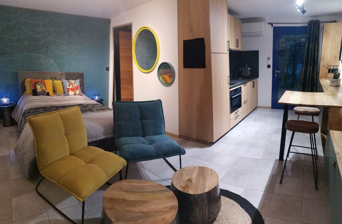 Domek 2 pokojowy o powierzchni 40 m2 idealny dla 2 osób, ale może pomieścić dziecko. Living room dining connected TV with netflix disney + premium video and apple tv+ provided downstairs.WIFI, equipped kitchen bathroom. Na piętrze znajduje się pokój dwuosobowy z wanną z hydromasażem, niestandardowym oświetleniem + 55-calowy ekran QLED z Apple TV, aby cieszyć się relaksem!! Parking 1 samochód lub motocykle (MILE WIDZIANI ROWERZYŚCI🔥) ⚠️ USŁUGI OPCJONALNE SĄ OBECNIE ZAWIESZONE⚠️