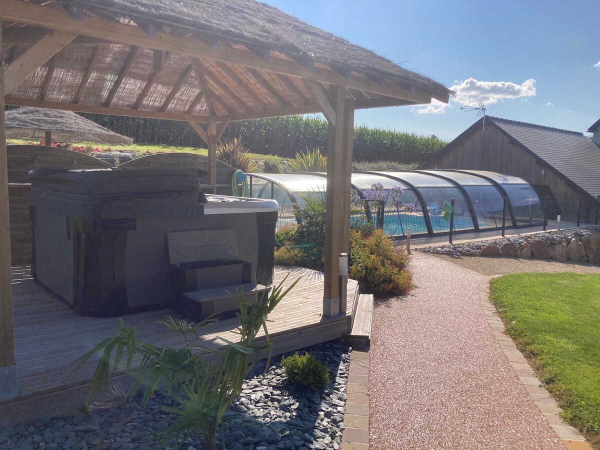 Dom dla 6 osób z dużym salonem, wyposażoną kuchnią, 3 sypialniami, 2 łazienkami, o powierzchni 90 m2, a obok apartamentu znajduje się strefa relaksu o powierzchni 85 m2. Z toaletą, szatnią, prysznicem. Sauna, łaźnia parowa, jacuzzi i basen z pływaniem pod prąd oraz aqua bike między Granville i Villedieu-les-Poêles. 15 minut od plaży, 40 km od Mont Saint Michel, 5 minut od zoo w Champrepus. 2 godziny w strefie relaksu wliczone w cenę za nocleg
