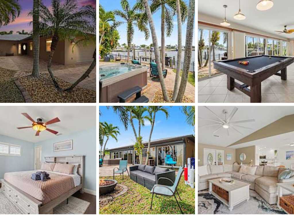 JEDNA Z NAJLEPSZYCH NADMORSKICH NIERUCHOMOŚCI W CAPE CORAL! Krótki spacer od plaży. Ten dom o powierzchni ponad 2500 stóp kwadratowych oferuje wspaniałe zachody słońca i widoki na wodę z południowego zachodu ze wszystkich głównych pomieszczeń mieszkalnych, a także z apartamentu głównego. Ogrzewany basen z kolorowym oświetleniem LED, wbudowane spa, wanna basenowa, pełna pralnia, Lanai, kominek, Wi-Fi i telewizory w każdej sypialni, prywatny dok. Łódź na windzie do wynajęcia z wypożyczalnią RPM. Duży garaż na 2 samochody z 5 rowerami, wózkiem plażowym i lodówką na miejscu.