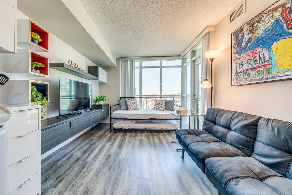 Własze własne studio/mieszkanie typu bachelor z widokiem na jezioro + wszystko, czego potrzebujesz, aby poczuć się jak w domu. Pracuj z zapierającym dech w piersiach widokiem, szybkim i stabilnym gigabitowym Wi-Fi, parkingiem wewnętrznym, klimatyzowanym i ogrzewanym apartamentem. Obudź się z bezpośrednim widokiem na jezioro Ontario z bliskiego 30 piętra. Bądź w centrum miasta, a jednocześnie blisko jeziora Ontario i Coronation Park. Kilka kroków od Exhibition, Budweiser stage, Porter Airport, CN tower, Rogers Centre, King St W i Liberty Village.