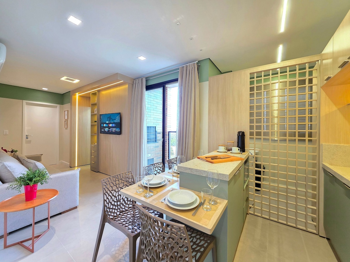 Abrace o aconchego neste lugar projetado com muito cuidado e carinho! Recém finalizado no centro de Foz, perto de tudo o que você precisa para que sua hospedagem seja perfeita. Andando você encontra supermercados, restaurantes, farmácias, posto de combustível, bancos, casa lotérica, cafés, bares noturnos, etc Espaço composto por uma suíte confortável, lavabo, sala de estar/tv/jantar, unificados com uma cozinha compacta e funcional, Na sacada você conta com uma mesa para desfrutar por do sol!