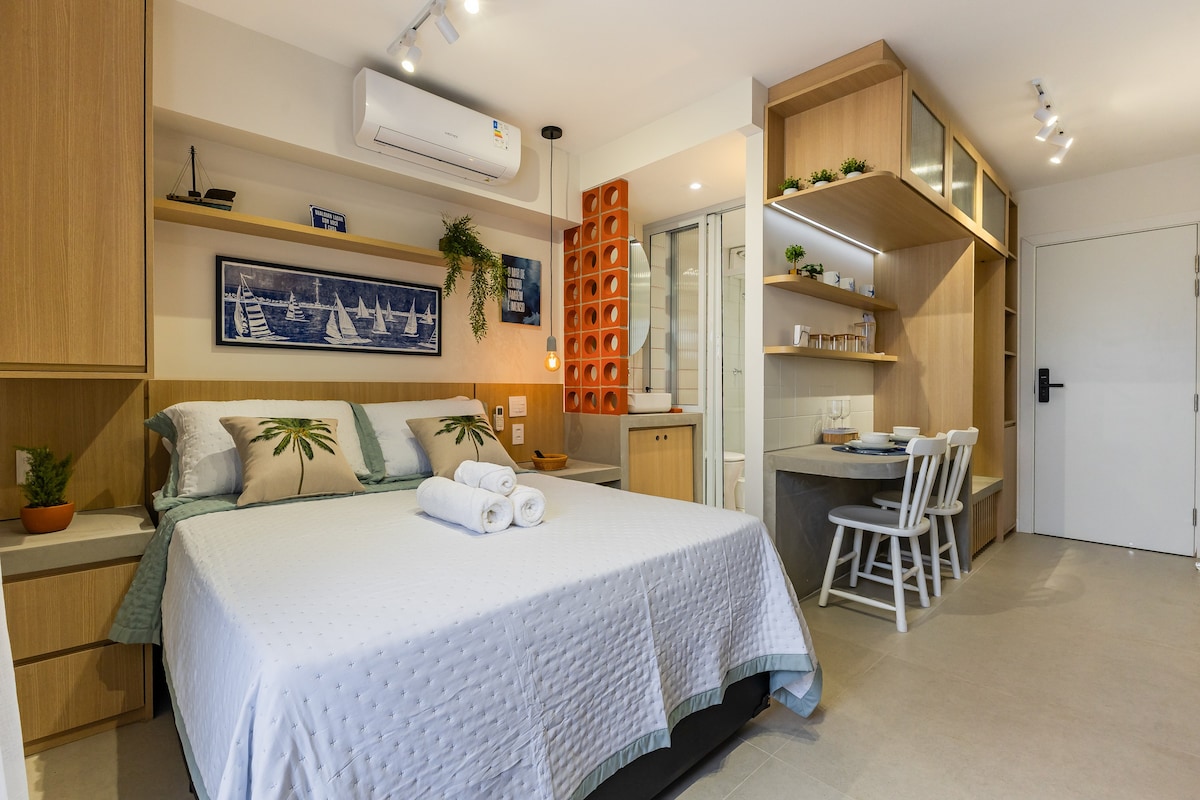 Nowe studio, z designem i architekturą w Vila Madalena. Studio znajduje się przy bardzo spokojnej, zadrzewionej ulicy, w pobliżu głównych barów, metra i restauracji urokliwej dzielnicy Vila Madalena. Studio posiada klimatyzację, minibar, ekspres do kawy Nespresso, materac marki Emma i wszelkie udogodnienia zapewniające wyjątkowy pobyt w São Paulo. W budynku znajduje się w pełni wyposażona siłownia, pralnia i basen.