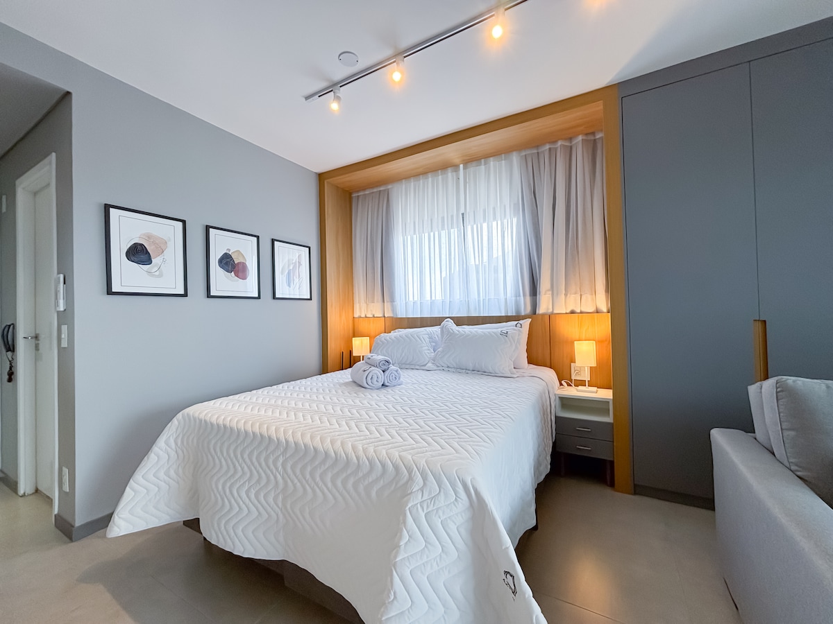 Studio butikowe z jednym z najpiękniejszych widoków na miasto São Paulo. Znajduje się 2 minuty spacerem od metra. W pełni wyposażona kuchnia z lodówką ukrytą za drewnianymi drzwiami. Wi-Fi, klimatyzacja i telewizor Smart TV 55 cali. Samodzielne zameldowanie z inteligentnym zamkiem elektronicznym. Zagraj w tenisa lub idź na siłownię, a następnie zrelaksuj się w basenach (na zewnątrz lub w ogrzewanym pomieszczeniu) i saunach (mokrych lub suchych). Przestrzeń wspólna obejmuje również przestrzenie coworkingowe i pralnię. Odwiedzający muszą być wcześniej zarejestrowani w recepcji.