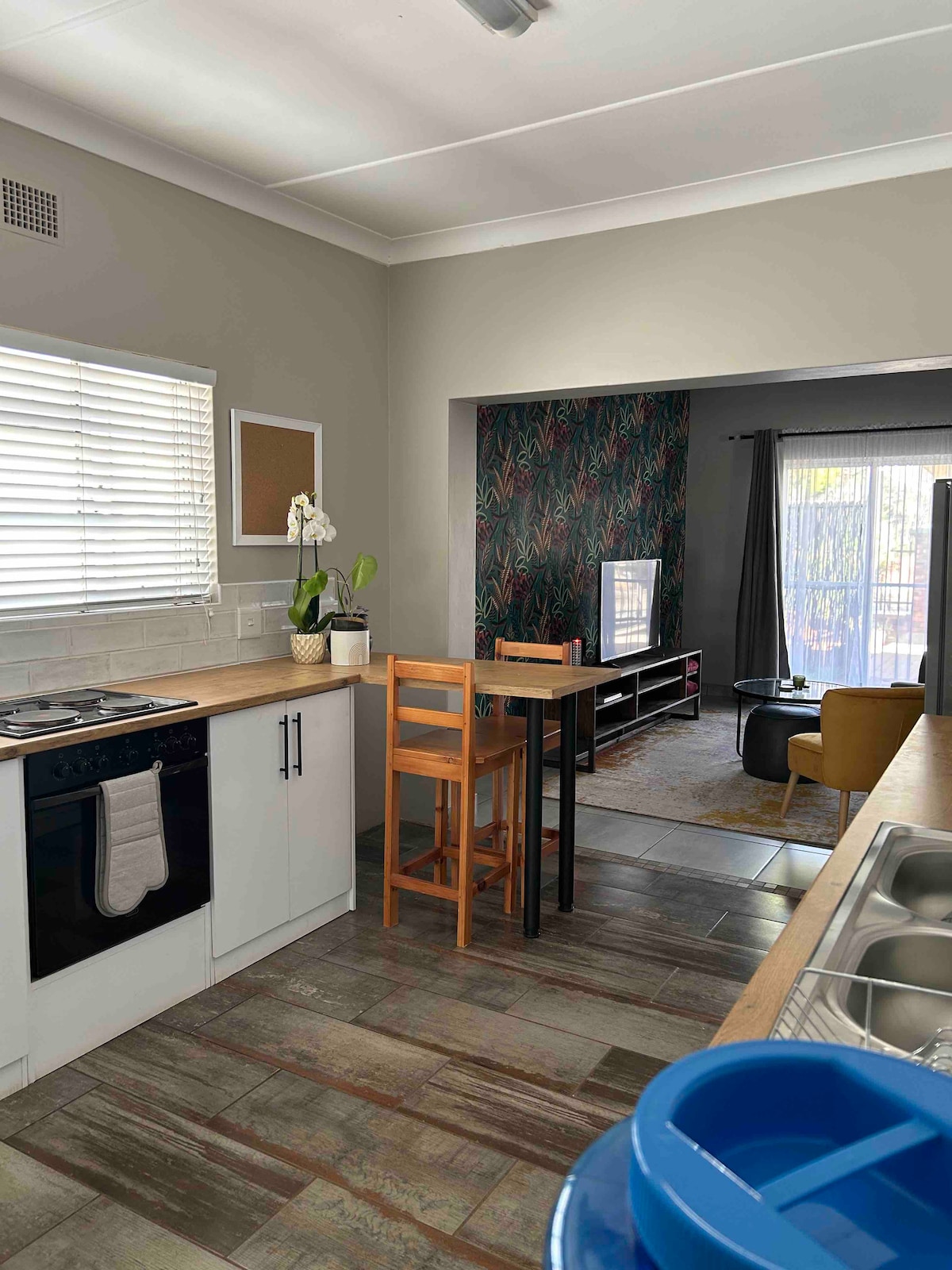 Modern 1-bedroom apartment in Carters Glen—ideal for business or leisure. Includes a King bed for couples or 2 single beds for colleagues (with electric blanket in winter), Smart TV, gas geyser, and inverter for Wi-Fi, TV, and phone charging during power outages. A 2400L JoJo tank ensures backup water. Enjoy a private patio with braai, access to a pool, undercover parking, and free Wi-Fi. Safe, quiet area—your home away from home in Kimberley!