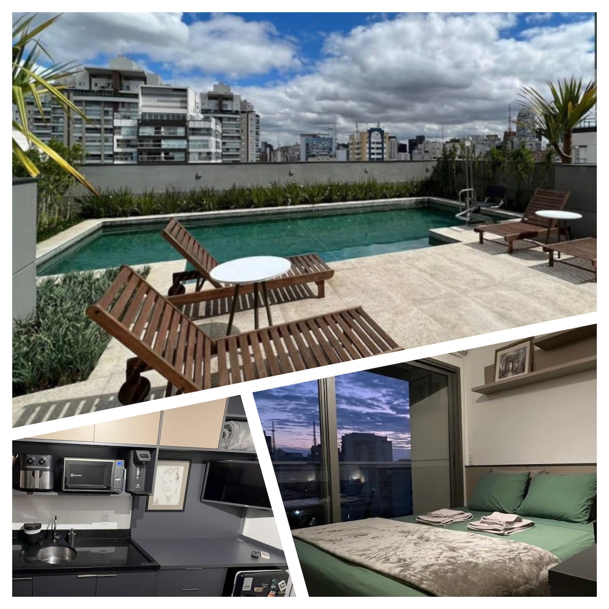 This new, well-equipped space offers a stunning urban view! Conveniently located near everything, exceptional comfort with a queen-size bed, high-quality linens, a fully equipped kitchen, an integrated balcony, air conditioning, smart TV and high-speed internet. Easily walk to parks, theaters, museums, restaurants, bars, clubs, supermarkets, pharmacies, and Frei Caneca mall. Paulista Avenue is 800m away and Sírio-Libanês Hospital is 300m away. The condominium features a rooftop pool and gym.