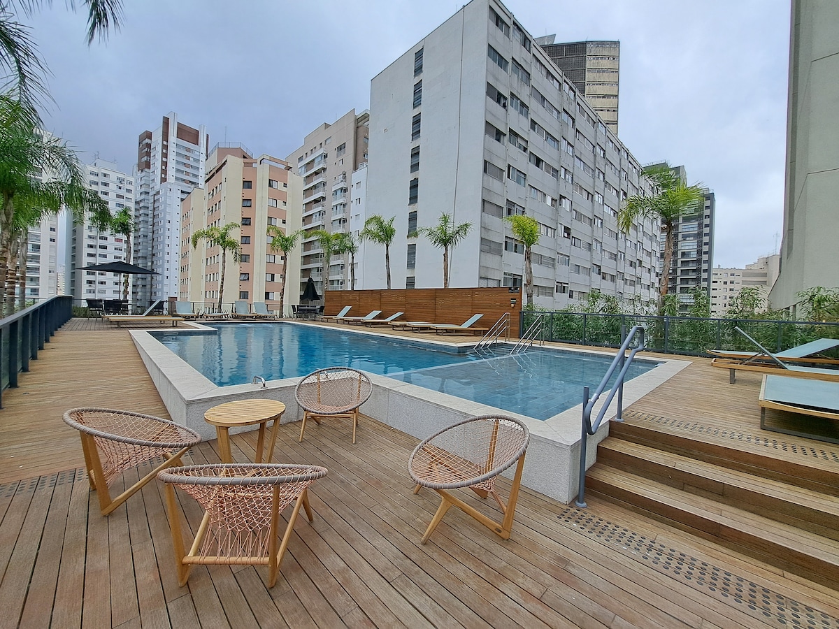Zainstalowano nową zasłonę zaciemniającą 🩷 Cama Queen obok Av. Paulista i kilka kroków od Shopping Frei Caneca, ponieważ najlepsze restauracje i sklepy, kino, teatr i targ. Apartament jest w pełni wyposażony, oprócz winiarni i klimatyzacji, Wi-Fi i Netflixa. 1 miejsce, a jeśli nie masz samochodu, z łatwością wybierzesz się na kilka pieszych wycieczek, skorzystasz z metra (snooze), Ubera/taksówki lub roweru (stacja do wypożyczenia obok). Basen na świeżym powietrzu i kryty, sauny, centrum fitness, coworking z salamami konferencyjnymi, minimarket i pralnia