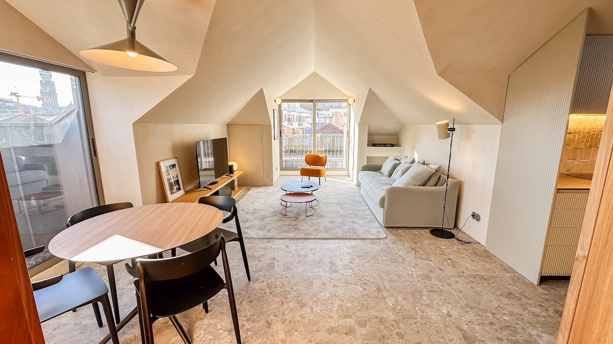Alves da Veiga Rooftop znajduje się w centrum Porto, zaledwie 2 minuty od Mercado do Bolhão. Jest to loft o powierzchni 200 m² z 2 sypialniami (jedną na górze i jedną na dole), 2 łazienkami (obie na dole), przestronnym tarasem i 2 balkonami. Jest pełen światła i przestrzeni dla maksymalnie 4 osób. Możesz zaparkować samochód na naszym prywatnym parkingu i wjechać windą na dach. Przestronny taras jest idealny do relaksu po długim dniu i wypicia butelki wina z widokiem na panoramę śródmieścia!