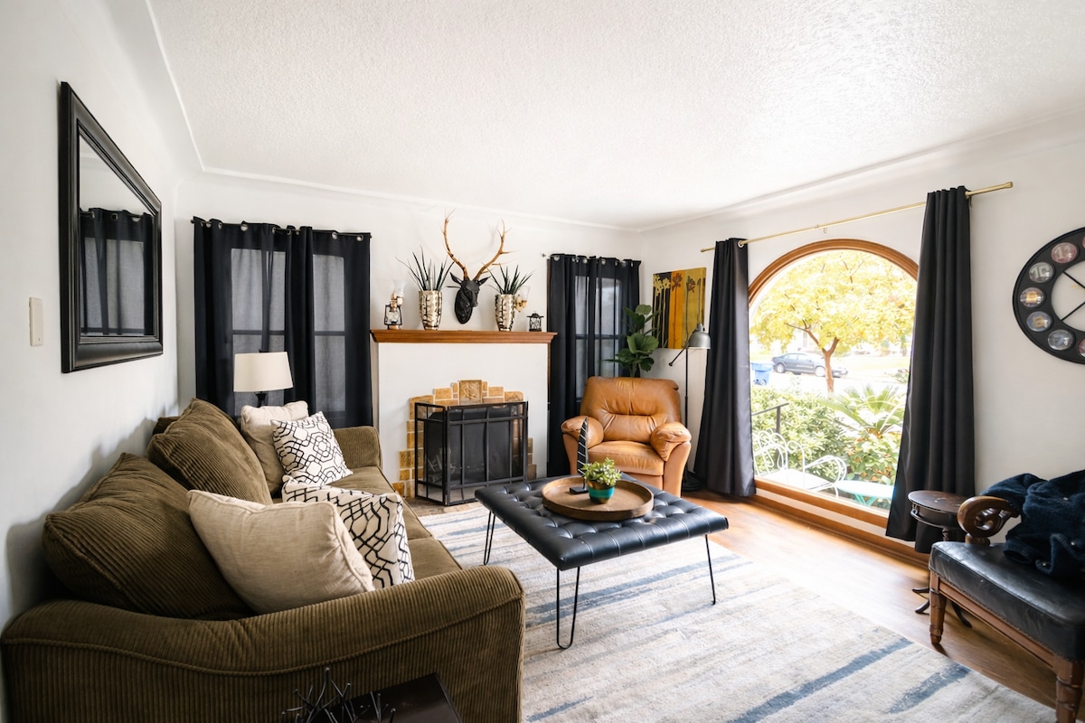 Zrelaksuj się i odpręż w swojej prywatnej oazie w tym nowo odnowionym domu w stylu Mid-Century Modern! Gdy wejdziesz do tego domu z 3 sypialniami i 2 łazienkami, zachwyci Cię stylowa architektura z połowy wieku i nowoczesny wystrój w stylu retro, które z pewnością Cię zainspirują! Stworzyliśmy przytulne, stylowe i relaksujące miejsce, w którym Ty i Twoi Twoi goście możecie się zrelaksować i odpocząć na spektakularnym podwórku lub po prostu spędzić dzień przy przytulnym kominku, ciesząc się płytami winylowymi!