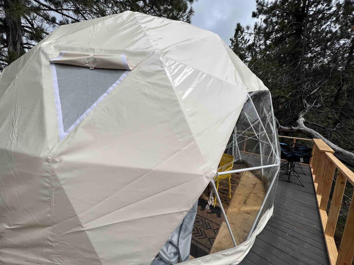 Glamp in style just 15 mins from Kings Canyon & Sequoia! Our cozy geodesic domes sit on 40 acres and include AC, WiFi, a smart TV, and a huge window with a beautiful view. Enjoy a private outdoor deck, access to a modern private bathroom (100 ft away), and a community outdoor kitchen with a grill. The dome offers sweeping views of the valley and surrounding mountains. Peaceful, unique, and perfect for couples or solo adventurers. During the winter, stay nice and warm with a pellet stove.
