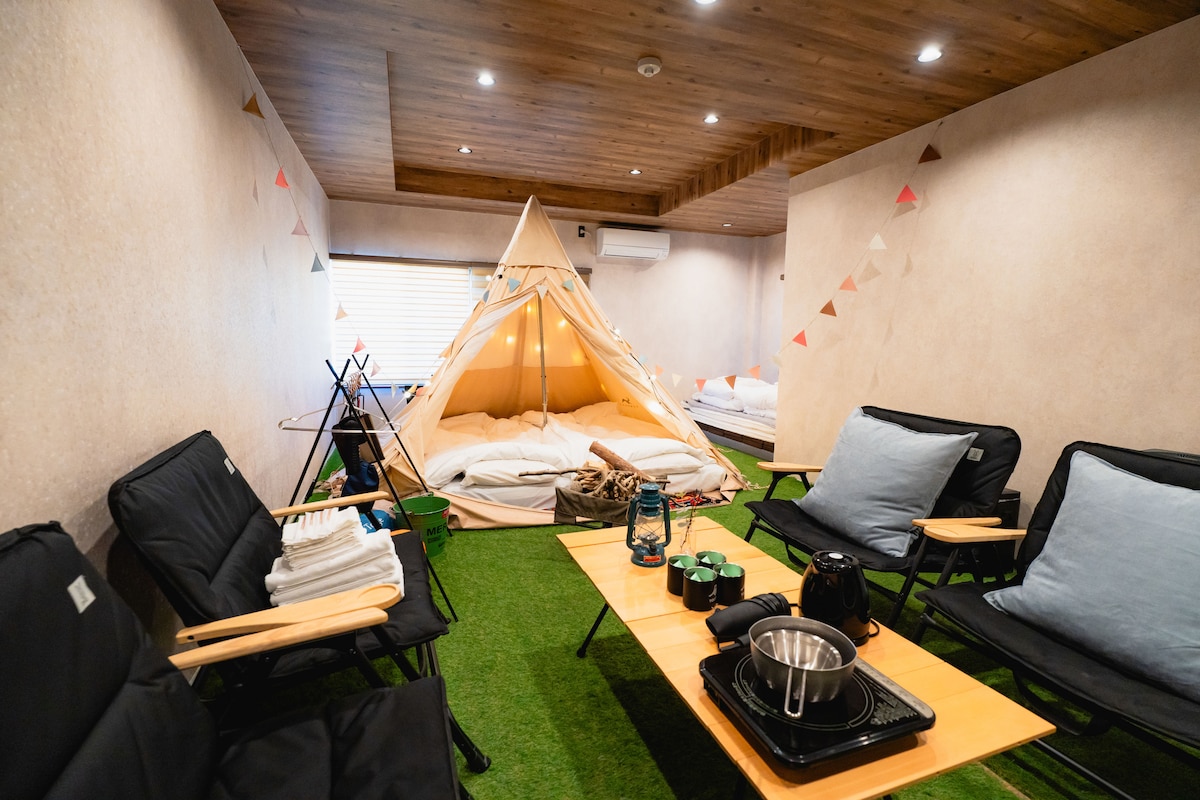 1 minuta spacerem od stacji Kawaguchiko! Wygodne, niezwykłe doświadczenie w stylowym glampingu! Namiot dzwonowy, namiot stożkowy, hamak