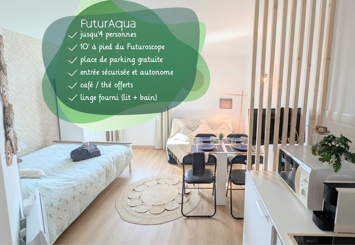 Witamy w naszym przytulnym studio, 4 minuty od Futuroscope i Areny! Idealne na romantyczny pobyt, nasze przytulne studio posiada wygodną rozkładaną sofę i wannę. W pobliżu znajduje się wiele restauracji i sklepów. Idealnie położone na relaksujący i wygodny pobyt, to studio jest idealnym miejscem na odpoczynek po dniu pełnym przygód. Wszystkie udogodnienia są obecne: pościel, ręczniki, szampon, kawa, pralka, Wi-Fi... Czekamy na Ciebie!