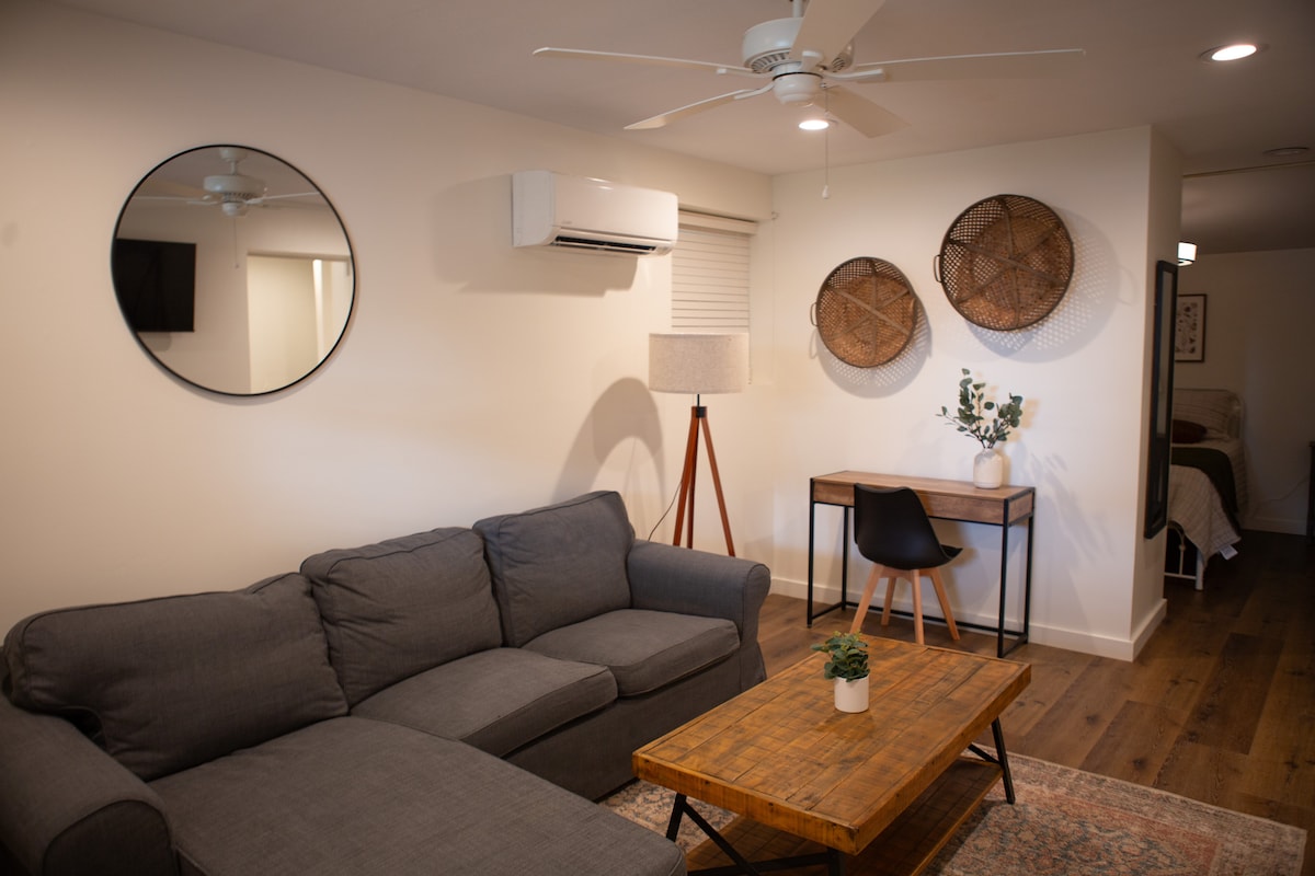 Na pewno pokochasz czas spędzony w naszym apartamencie. To apartament typu studio o powierzchni 750 stóp kwadratowych, wyposażony we wszystko, czego potrzebujesz, aby mieć idealny pobyt. Studio jest dołączone do naszego domu, ale masz własne wejście i całą przestrzeń dla siebie. Kluczowe cechy to: prywatna łazienka z nową, wspaniałą, wyłożoną kafelkami kabiną prysznicową, otwarta przestrzeń ze sklepionymi sufitami, aby zoptymalizować przestrzeń, a także kuchnia na zamówienie ze wszystkim, czego potrzebujesz!