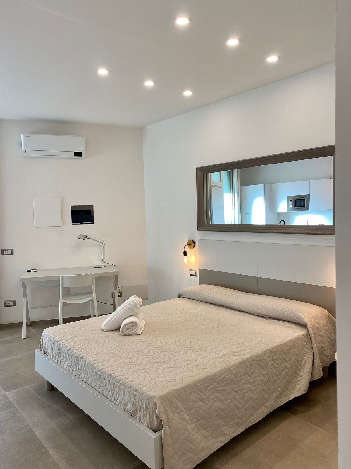 Ciesz się bezproblemowym pobytem w tym całkowicie odnowionym mieszkaniu z bezprogowym wejściem na spokojnej ulicy. Może pomieścić 4 osoby z łóżkiem typu king, rozkładaną sofą premium (z dodatkową nakładką dla wygody) i elegancką, w pełni wyposażoną kuchnią CREO. Dwa telewizory Smart TV, szybkie Wi-Fi i klimatyzacja w każdym pokoju. Bezpłatny, łatwy parking przy ulicy. Spacer do Corso Umberto (8 min) lub malowniczego bulwaru nadmorskiego (15 min); plaże są oddalone o 15 min jazdy samochodem. Nieskazitelne, profesjonalnie zarządzane i idealnie nadające się do łatwego życia w mieście