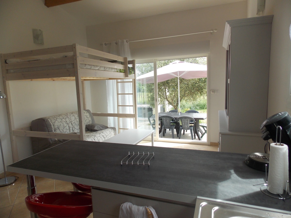 Nasze mieszkanie, studio o powierzchni 24 m2, zbudowane z suchego kamienia, położone jest na wzgórzach Nîmes i jest idealnym miejscem do regeneracji, pracy lub odzyskania zdrowia. W spokoju i na łonie natury, bez żadnych przeszkód, każdy znajdzie swój kąt w cieniu lub na słońcu, w hamakach, na leżakach lub przy wspólnym basenie.
