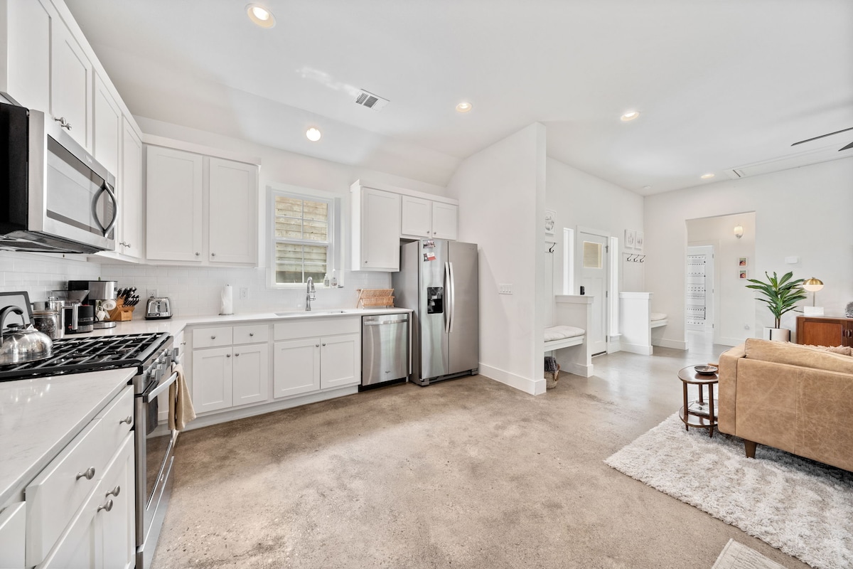 Beautifully decorated guesthouse in the heart of East Austin that feels like a real home. Be close to downtown and East Austin activities in a quiet and comfortable space. Explore nearby bars, restaurants, coffee shops, breweries, retail stores, art studios, and nature trails. * 1 bedroom, 1 bathroom * Full kitchen with cooking supplies * Vintage mid-century furniture * Full size washer/dryer * Private patio * Shared courtyard * Treehouse cabin with deck * Pet-friendly