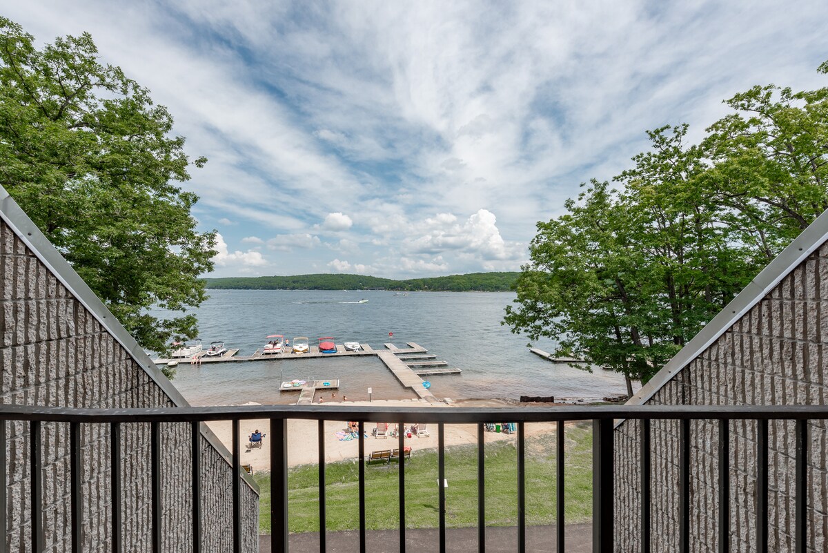 Lakefront one-bedroom, one-bath condo with private patio and wood fireplace. (Elevator access included) Hotel amenities available to all guests: Indoor pool and split-level whirlpool hot tub, two onsite dining locations, 240' of sandy beachfront and docks, fitness center, game room, racquetball court, covered parking, free WIFI, and a lakefront view with every room!