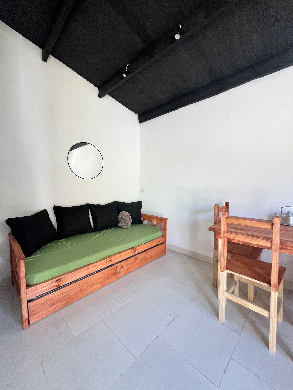 A mts del Mar. *Lejos del ruido, cerca de todo!* 🏠depto tipo cabaña. El espacio es concepto abierto, sin divisoria, con excelente iluminación, tipo loft. 🌳🌷🌾Confortable parque con flores, espacio recreativo, árbol de tilo, cerezo. A mts del Parque de los Patricios y a pasos del centro. Propiedad horizontal de 70 mts. (El predio es totalmente cerrado y son dos las casas.) Zona residencial, combina la cercanía al mar con la tranquilidad. Se aceptan mascotas
