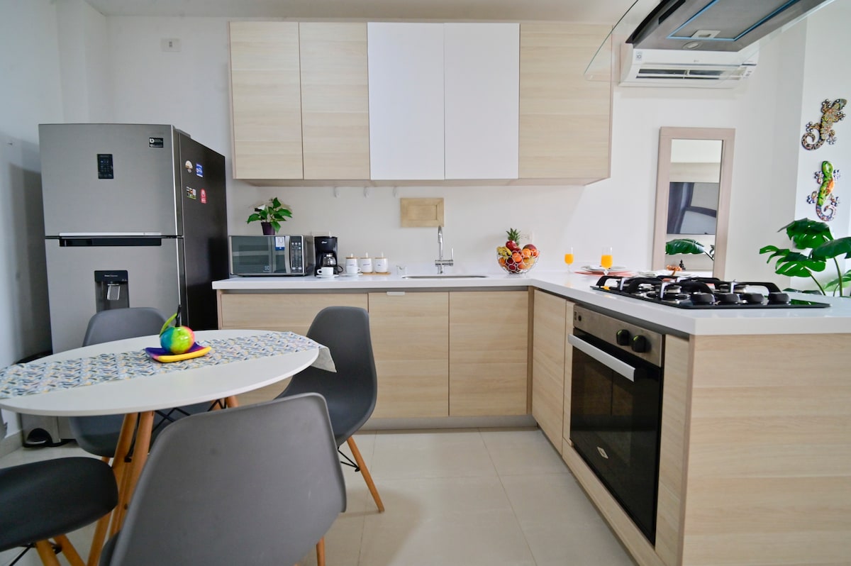 Witamy w naszym nowym lofcie z jedną sypialnią w centrum Kartageny w Kolumbii. Ciesz się obfitym naturalnym światłem, dwiema łazienkami, w pełni zaopatrzoną kuchnią i dostępem do udogodnień w budynku, takich jak winda, taras i basen z wspaniałymi widokami. Idealnie położony między starym miastem a dzielnicą Getsemaní, pozwoli Ci zanurzyć się w tętniącej życiem kulturze Kartageny. Zarezerwuj teraz i spędź niezapomniany pobyt!