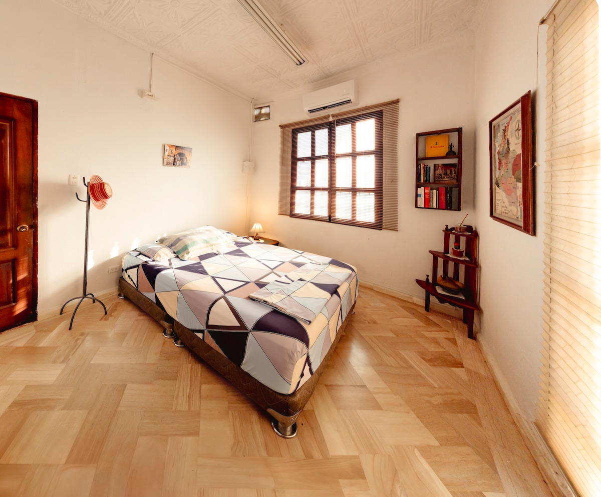 El alojamiento esta ubicado en el histórico y bello vecindario de Getsemani, el cual esta lleno de colores y mucha historia que debes recorrer. tiene calles mágicas y con mucho arte, pero lo mas valioso es su gente diversa. Por el sector se puede caminar con toda seguridad, nuestra casa tiene dos pisos, en el piso superior está la habitación y que cuenta con 3 camas, aire acondicionado un baño y un pequeño balcón, en el primer piso tenemos sala, cocina equipada un baño y un patio con lavadora.