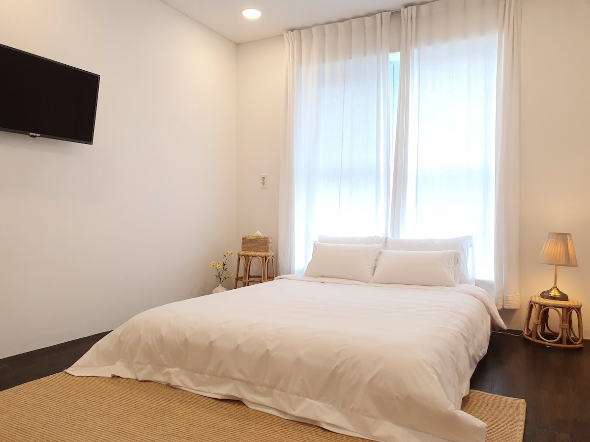 [Opis obiektu] „Malgang-gori” to w dialekcie Jeju oznacza czysty (zadbany) dom. Jest to nowo wybudowany, prywatny dom z 3 piętrowym dachem, położony 3 minuty spacerem od plaży Hyeopjae. Atrakcją jest widok na plażę Hyeopjae, wyspę Biyangdo i górę Hallasan (z dachu). [Przestrzeń użytkowa] 3 piętro (dom): 2 pokoje + salon + kuchnia + 2 toalety Prywatny dach: mini basen (ciepła woda X) + miejsce na grilla [Udogodnienia/przedmioty do użytku] ① AGD: klimatyzacja systemowa (we wszystkich pomieszczeniach), TV, Wi-Fi Suszarnia do włosów, bidet, pralka, suszarka, odkurzacz ② Kuchnia: oczyszczacz wody, indukcja, lodówka, ryżowiec elektryczny, kuchenka mikrofalowa, naczynia Garnek, zestaw patelnią, przybory kuchenne, łyżki, kubki, zestaw noży Ekspres do kawy na kapsułki, toster, czajnik elektryczny, deska do krojenia Detergenty i inne przybory kuchenne ③ Pościel: 2 pojedyncze łóżka elektryczne Temper Original 4 materace nawierzchniowe typu super single, kołdra ④ Łazienka: szampon, odżywka, żel pod prysznic, mydło (jednorazowego użytku) Pasta do zębów (jednorazowa), ręczniki (2 sztuki na osobę) ⑤ Napoje: dostępna kawa w kapsułkach, mieszanka kawowa, zielona herbata ⑥ Grill (wyłącznie na dachu): palnik gazowy, ruszt, stół na dachu (Brak kosztów, gaz butanowy przygotowany, może nie być dostępny w zależności od warunków pogodowych)