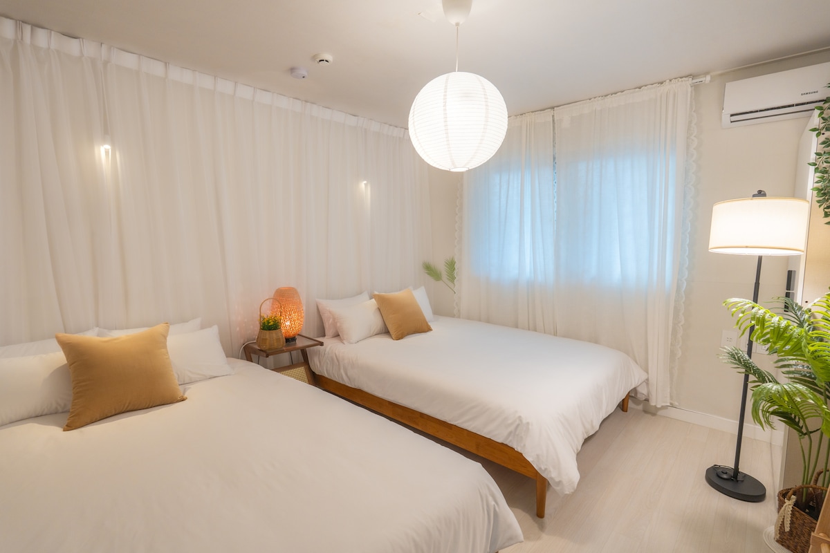 Hue Stay oferuje eleganckie i schludne wnętrza o dużej powierzchni 35 pyeongów, utrzymane w białej i drewnianej tonacji. Hotelowa pościel i oświetlenie zapewniają komfort i wygodę. Możesz odpocząć w przestronnym pokoju o powierzchni 35 pyeongów. ※ Ważne ※ Jest to 4 piętro i nie ma windy. Proszę dokonać rezerwacji na całkowitą liczbę gości, niezależnie od tego, czy są to dzieci, czy nie (2 osoby dorosłe, 2 dzieci => 4 osoby) Zostanie to ustawione zgodnie z liczbą zarezerwowanych osób. Rezerwacja dla 2 osób - 2 pokoje gościnne (1 łóżko typu queen). Rezerwacja dla 3 osób - 1 pokój gościnny (1 łóżko typu queen, 1 łóżko typu super single).