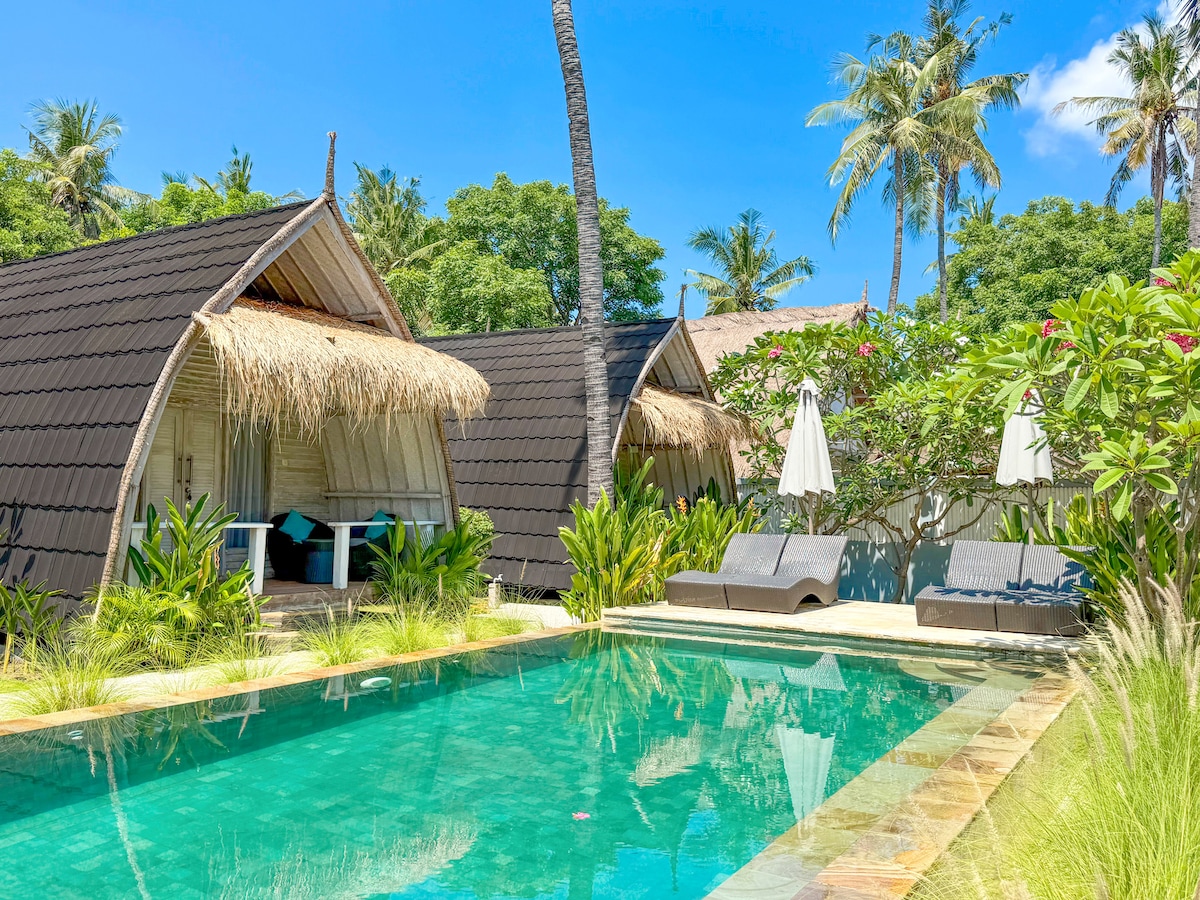 Gili Meno Escape oferuje 6 bungalowów typu Deluxe tylko dla dorosłych (18+) Zaledwie kilka minut od białych, piaszczystych plaż i krystalicznie czystej wody – masz gwarancję wypoczynku na tropikalnej wyspie. Nasze domki typu Deluxe oferują wszystkie codzienne udogodnienia, w tym klimatyzację, ciepłą wodę, telewizję z filmami, Wi-Fi, sejf, minibar i codzienne odświeżanie pokoju. Śniadanie jest wliczone w cenę, a rowery są dostępne na miejscu do dziennego wypożyczenia. Goście mogą również korzystać z naszego prywatnego basenu.
