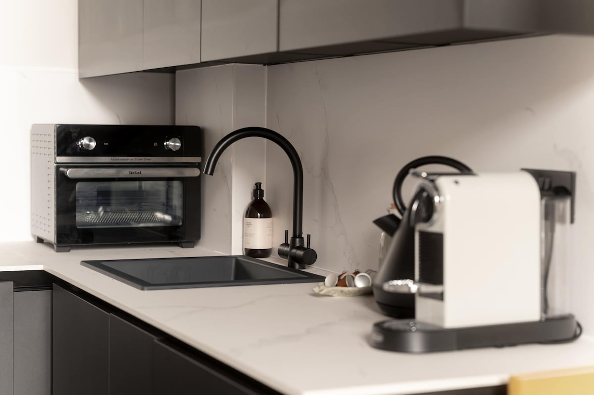 Witaj w swoim domu z dala od domu! Zrelaksuj się w naszym przytulnym pensjonacie z pluszową skórzaną kanapą, elektrycznym kominkiem i telewizorem na ścianie. Gotuj w w pełni wyposażonej nowoczesnej kuchni z eleganckimi urządzeniami i czarno-białą jadalnią. Odpręż się w stylowej łazience ze szklaną kabiną prysznicową i wanną, a następnie odpocznij w spokojnej sypialni z wygodnym podwójnym łóżkiem i stolikami nocnymi. Doświadcz komfortu, stylu i wygody w naszym zachęcającym pensjonacie – idealnym miejscu na wypoczynek.