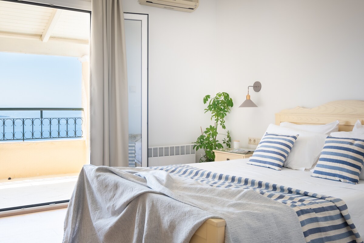 Ciesz się tym letnim wypoczynkiem położonym na klifie Kalami Bay. Wspaniały widok na zatokę sprawi, że będzie to idealne miejsce na relaks, a słońce i krystalicznie czysta woda Morza Jońskiego sprawią, że Twoje wakacje będą niezapomniane. Ten przytulny apartament posiada łóżko typu queen size, prywatną łazienkę i kuchnię oraz oczywiście prywatny balkon z pięknym widokiem na morze. Plaża i wioska znajdują się 5 minut spacerem.