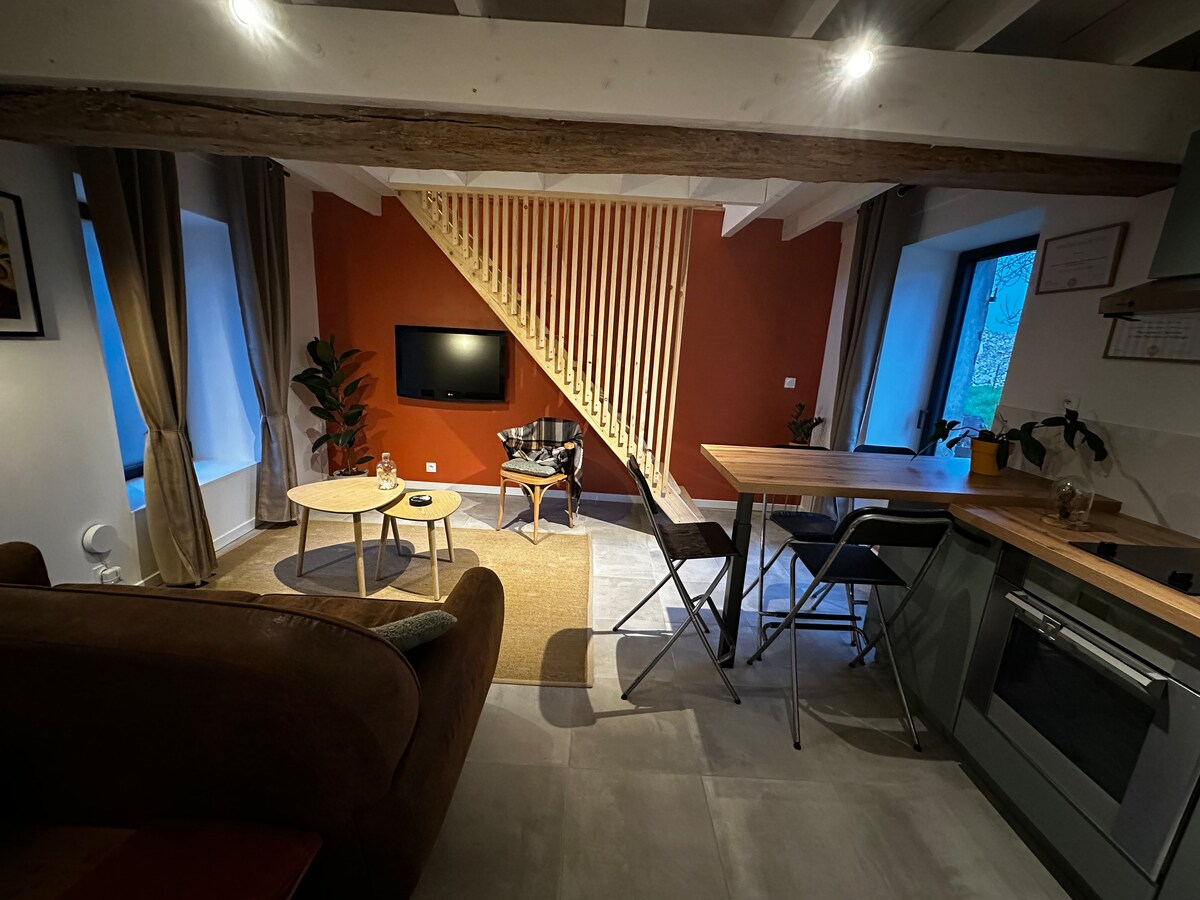 En campagne avec son coin de verdure. Un hall d'entrée avec machine à laver, un étendoir et WC. Ensuite, une cuisine bien équipée (crêpière, appareil à raclette, four, plancha) avec une cuisinière, vue sur la terrasse. (barbecue, mobilier.) À l'étage, le salon, une salle de douche, WC, 2 chambres communicantes : la seconde, avec un coin bureau, se situe dans le prolongement de la première. Cette disposition conviviale est particulièrement adaptée aux familles avec enfants ou aux amis.