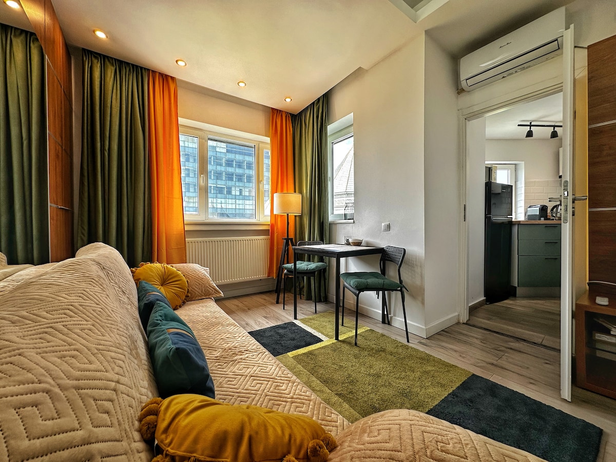 This beautiful and bright studio is located in the heart of Bucharest, right at the vivid Amzei square, a short walking distance from the Old Town. Location wise it doesn't get any better than this. From the large Terrace you have a beautiful city view. The place is easily accessible by public transport (bus & metro). This stylish flat was fully refurbished in the summer of 2023 with high standard materials and has all possible amenities available for a perfect stay.