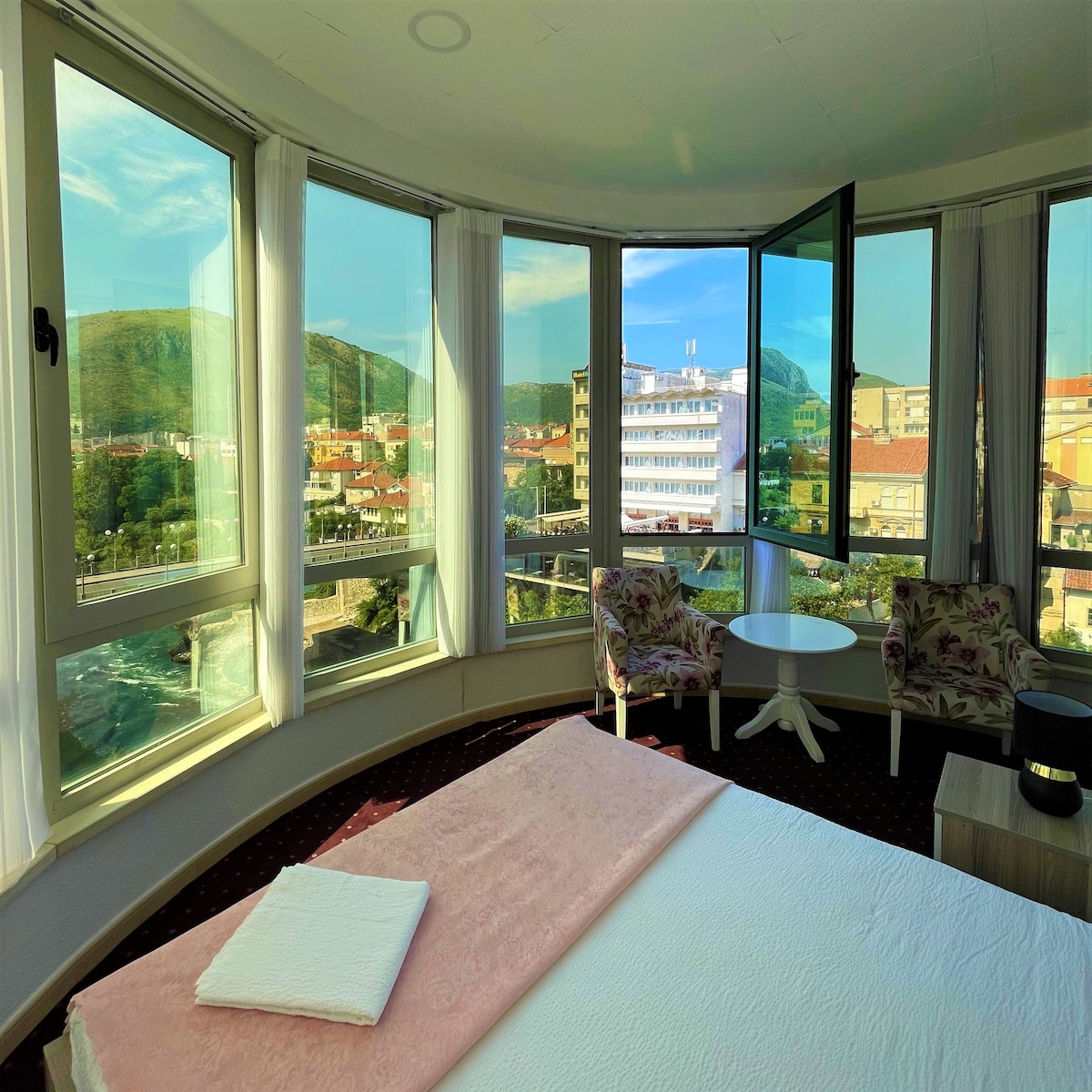 Apartament położony jest w centrum miasta, nad rzeką Neretwą z niesamowitym widokiem na rzekę i stare miasto. Zaledwie 400 m od Starego Mostu i Kujundziluk - Stary Bazar; 500 m od Muslibegovic House, jesteśmy blisko wszystkich zabytków, sklepów, kawiarni i restauracji. Jest idealny dla par, rodziny, małej grupy przyjaciół, aby zrelaksować się i cieszyć weekendowy wypad w małym i urokliwym mieście Mostar.