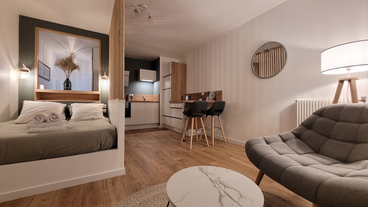 Witamy w L'Escapade Zen, luksusowym schronieniu, w którym spokój łączy się z nowoczesnym komfortem. Ten elegancki apartament położony jest nad samym morzem, w pobliżu centrum miasta i może pomieścić do 4 osób. Odkryj duży salon, wysokiej klasy kuchnię, sypialnię z łóżkiem typu Queen size i saunę na podczerwień. Ciesz się chwilą czystego relaksu w strefie balneoterapii. Wi-Fi, telewizja kablowa i Netflix Każda chwila w tej oazie spokoju zaprasza do ucieczki od codzienności.