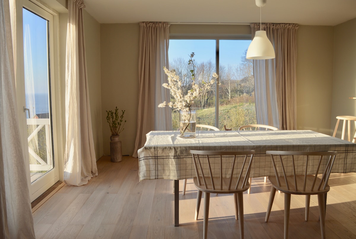Świetny domek letniskowy na szczycie wzgórza w cichej, zielonej okolicy. Ze wszystkich pokoi w domu można podziwiać fantastyczny widok na Gudhjem, z jego czerwonymi dachami, stary młyn i morze. Blisko WSZYSTKIEGO: sklepy, restauracje, muzea, port, wypożyczalnia rowerów, kino, kryty basen, klify i morze.