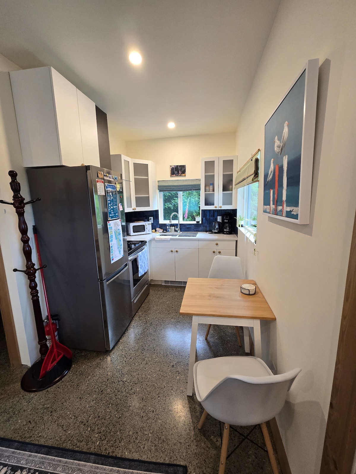 Keep it fresh and simple at this peaceful and centrally located downstairs, queen-bed, studio apartment. Up a paved no through road, it is an easy 2 min walk to the Daajing Giids farmer's market, grocer and post office. This studio is part of a brand new build completed in 2023. It includes an electric vehicle charger. Ideal for one to two occupants, the apartment has everything you need to be self sufficient including washer, dryer, full kitchen and full bathroom.