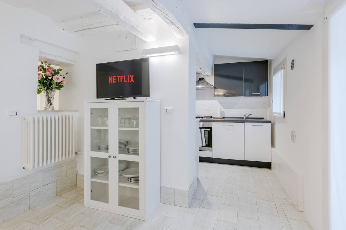 Małe, zadbane w każdym szczególe mieszkanie, idealne dla dwóch osób, położone 10 minut od Placu Świętego Marka. Prywatny widok na kanał z jednej strony i dziedziniec z drugiej strony sprawiają, że jest wyjątkowy. Dom wyposażony jest w klimatyzację i bezprzewodowy Internet bez ograniczeń, a w pobliżu znajdują się liczne sklepy, cykletterie i typowe restauracje. Zgodnie z przepisami dotyczącymi zapobiegania zakażeniom Covid-19, po każd każdego pobytu przeprowadzana jest dezynfekcja ozonem.