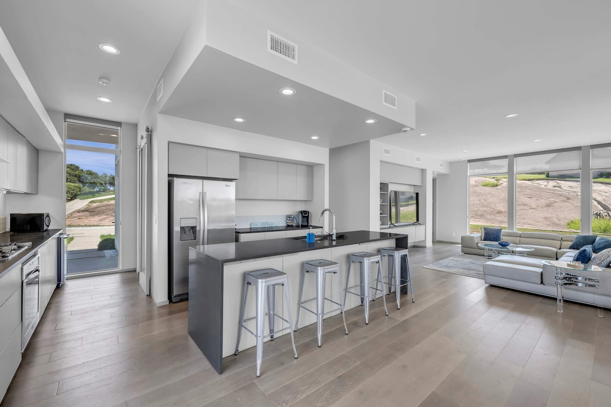 DZIEŃ W RAJU NA SZCZYCIE WZGÓRZA Obudź się w promieniach słońca wpadających przez okna sięgające od podłogi do sufitu, a następnie udaj się do kuchni na świeżym powietrzu, aby napić się kawy. Spędź poranek na wodzie, wiosłując po zatoce w kajaku lub po prostu relaksując się na pomoście. Po obiedzie zagraj w gry rodzinne w domu lub udaj się na zewnątrz na przestronny taras, z którego roztacza się wspaniały widok na rzekę. Gdy słońce zajdzie, zrelaksuj się przy grillu i kolacji pod zadaszeniem z napędem elektrycznym, a następnie podziwiaj gwiazdy z balkonu.