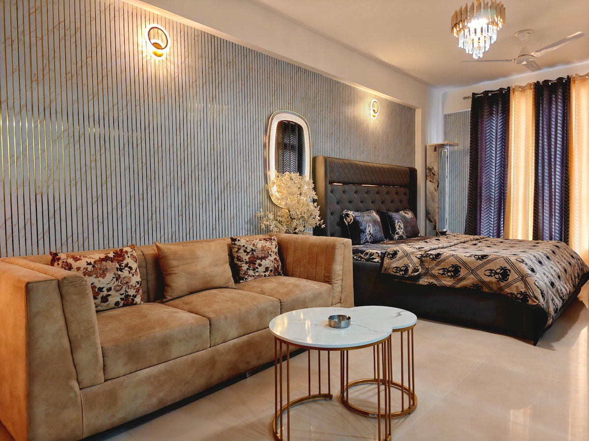 ➽ Przestronny apartament 1BHK z dołączonym patio, w pełni klimatyzowany. Wszystkie pokoje wyposażone są w klimatyzację o mocy 1,5 t. ➽ Nieruchomość skierowana w stronę słońca w dzielnicy o wysokich dochodach, otwarta z trzech stron, skierowana w stronę parku i dobrze wentylowana z dużą ilością naturalnego światła i świeżego powietrza. ➽ Wysokiej klasy projektor z soundbarem 25 W i Amazon FireStick z aplikacjami OTT. ➽ W pełni wyposażona kuchnia z niezbędnymi akcesoriami do wygodnego gotowania. ➽ Zrelaksuj się na pięknym prywatnym patio z oświetleniem nastrojowym i unikalnym systemem Foger do chłodzenia patio.