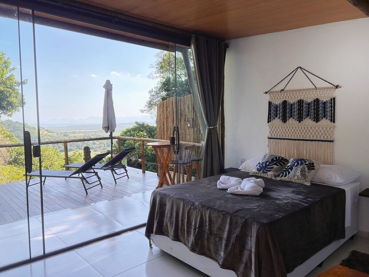 Chalet da Paz to rustykalny loft eukaliptusowy, nowy( otwarty 23 lutego22 roku), zbudowany wśród przyrody. Z balkonu z jacuzzi rozciąga się piękny widok na las, morze na horyzoncie i niezapomniany zachód słońca. Klimatyzacja , 55"TV i duży widok we wszystkich pomieszczeniach. Pięknie urządzony apartament z łóżkiem typu king-size, zupełnie nową białą pościelą i ręcznikami. Kuchnia jest w pełni wyposażona. Posiada kuchenkę, lodówkę, kuchenkę mikrofalową, sztućce, garnki, patelnie i naczynia.