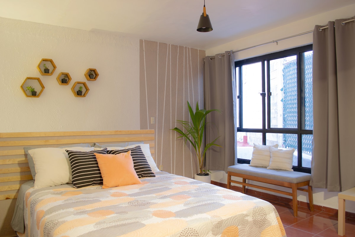 The lifestyle option at Las Sabilas Guesthouse, this lightful apartment features French doors that open to a neighborhood street, its own kitchen, and abundant space for two or three. Nadaje się na Netflix i relaks, popołudniową drzemkę po kąpieli w basenie lub spontaniczną kolację z nowymi przyjaciółmi z Guadalajary. Jesteśmy przyjaźnie nastawieni do gejów i lesbijek. Mamy inne pokoje na stronie www.airbnb.com/p/lassabilas