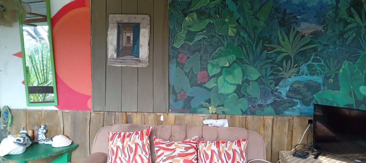 hostel coco de rasta ofrece un anbiente tranquilo rodeado de naturaleza a pocos minutos de la playa o en tuktuk de la casa .puedes usar nuestras tablas de surf si es lo que te gusta .