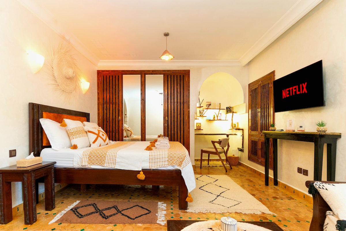 W centrum miasta, w pobliżu restauracji, sklepów i udogodnień, ten przestronny, jasny apartament oferuje wyjątkowe wrażenia. Ciesz się prywatnym jacuzzi, eleganckim wystrojem, pięknym tarasem z huśtawką i wszelkimi udogodnieniami: klimatyzacją w każdym pokoju, wyposażoną kuchnią, Netflixem, zapasową pościelą, deską i suszarką. Wszystko jest zaprojektowane tak, aby Twój pobyt był idealny. Zgodnie z marokańskim prawem i regulaminem domu, nieżonatym parom marokańskim nie wolno