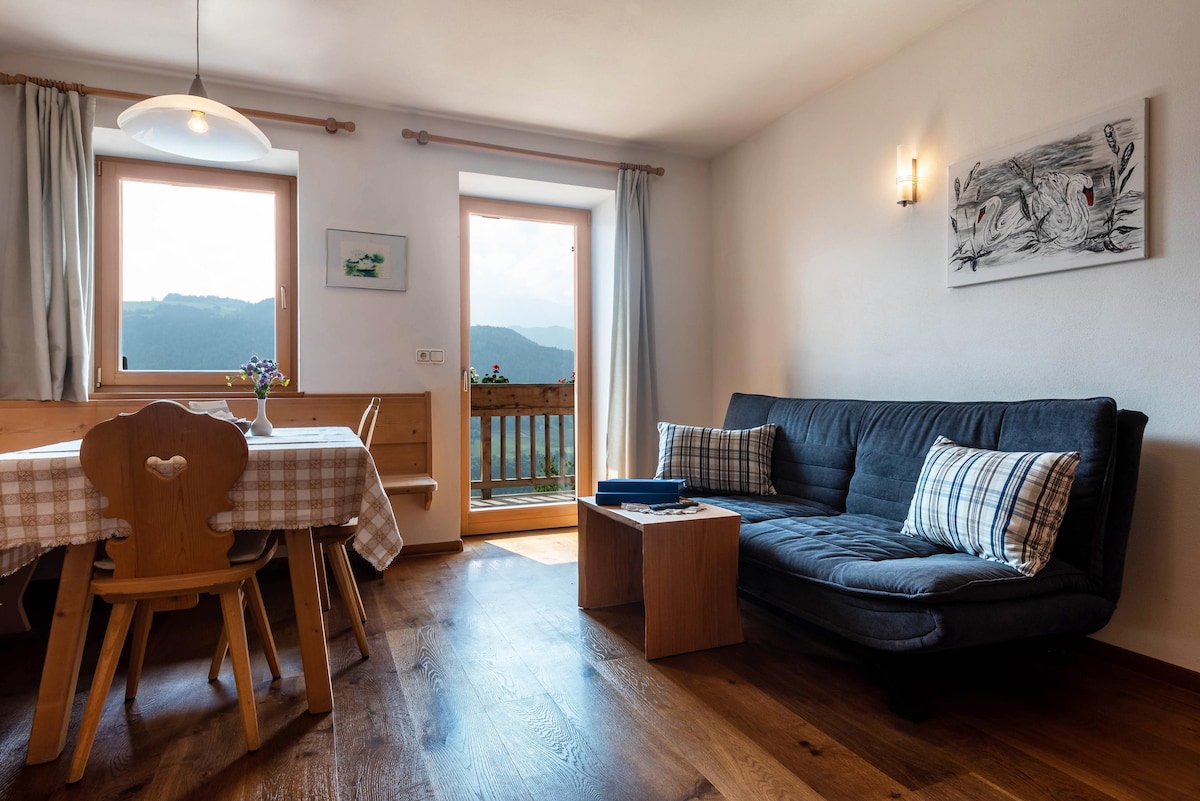 Jeden z naszych pięciu delikatnie odnowionych apartamentów na drugim piętrze uroczego, charakterystycznego gospodarstwa agroturystycznego. To jeden z najstarszych budynków przytulnej wioski w Valle d'Isarco w północnych Włoszech. Znajdujemy się w samym centrum słonecznego Tyrolu Południowego, na szczycie wzgórza, u wejścia do dolin Gardena i Funes. Blisko gór dolomitów, ale niedaleko popularnych miast Bolzano i Bressanone - to idealny punkt wyjścia do zwiedzania regionu.