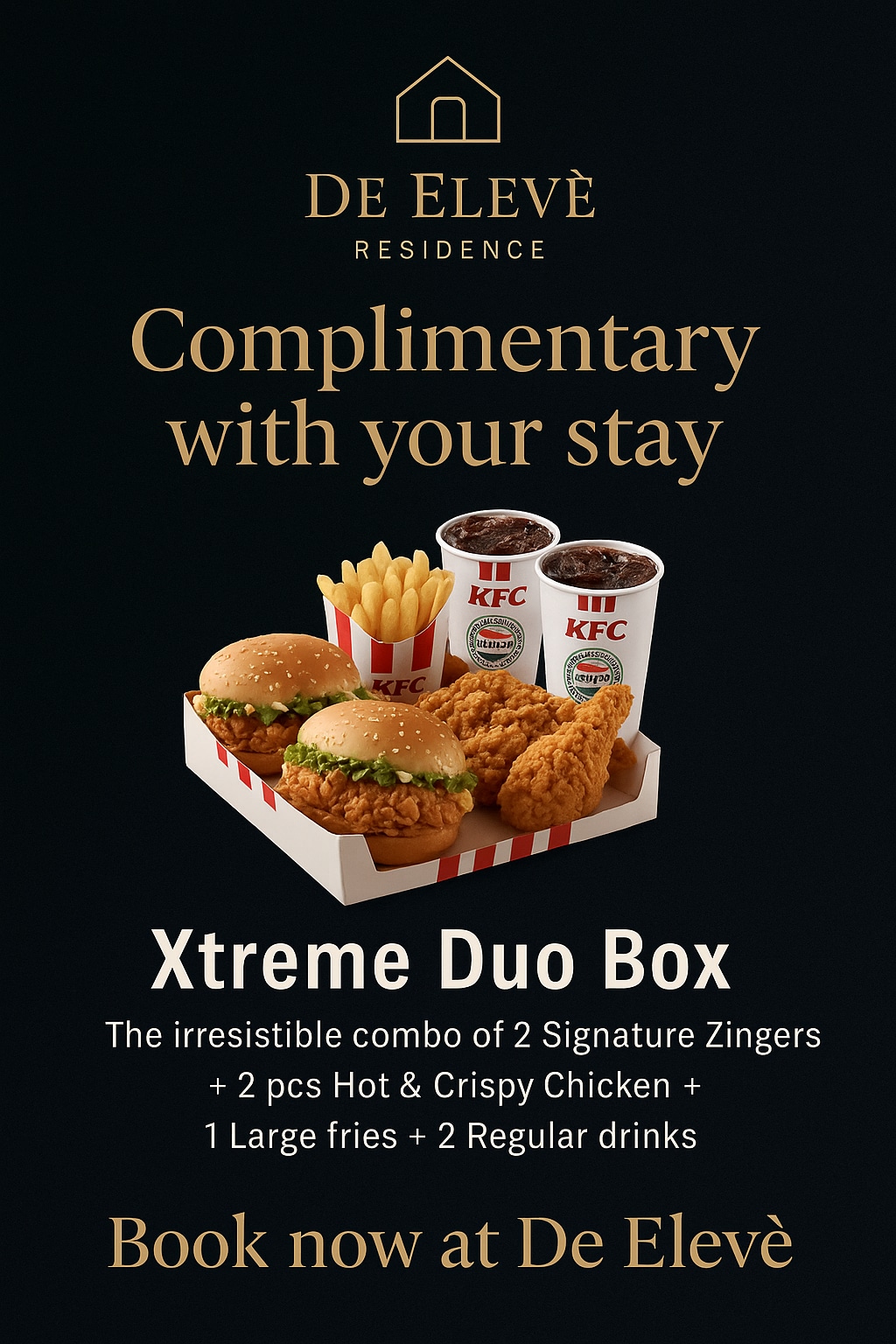 Rozkoszuj się luksusowym doświadczeniem w naszym designerskim studio butikowym z 1 sypialnią, położonym w samym sercu Bahrii w Islamabadzie. *DE ELEVE X KFC* Skorzystaj z bezpłatnego zestawu Xtreme Duo Box, który zostanie dostarczony pod Twoje drzwi. Doświadcz luksusowych posiłków podczas pobytu! Ten wykwintny ośrodek wypoczynkowy łączy elegancki styl i bogaty komfort, w komplecie z luksusowymi udogodnieniami. Idealne dla wymagających osób podróżujących służbowo, małżeństw, rodzin i samotnych odkrywców szukających wyrafinowanej przystani!