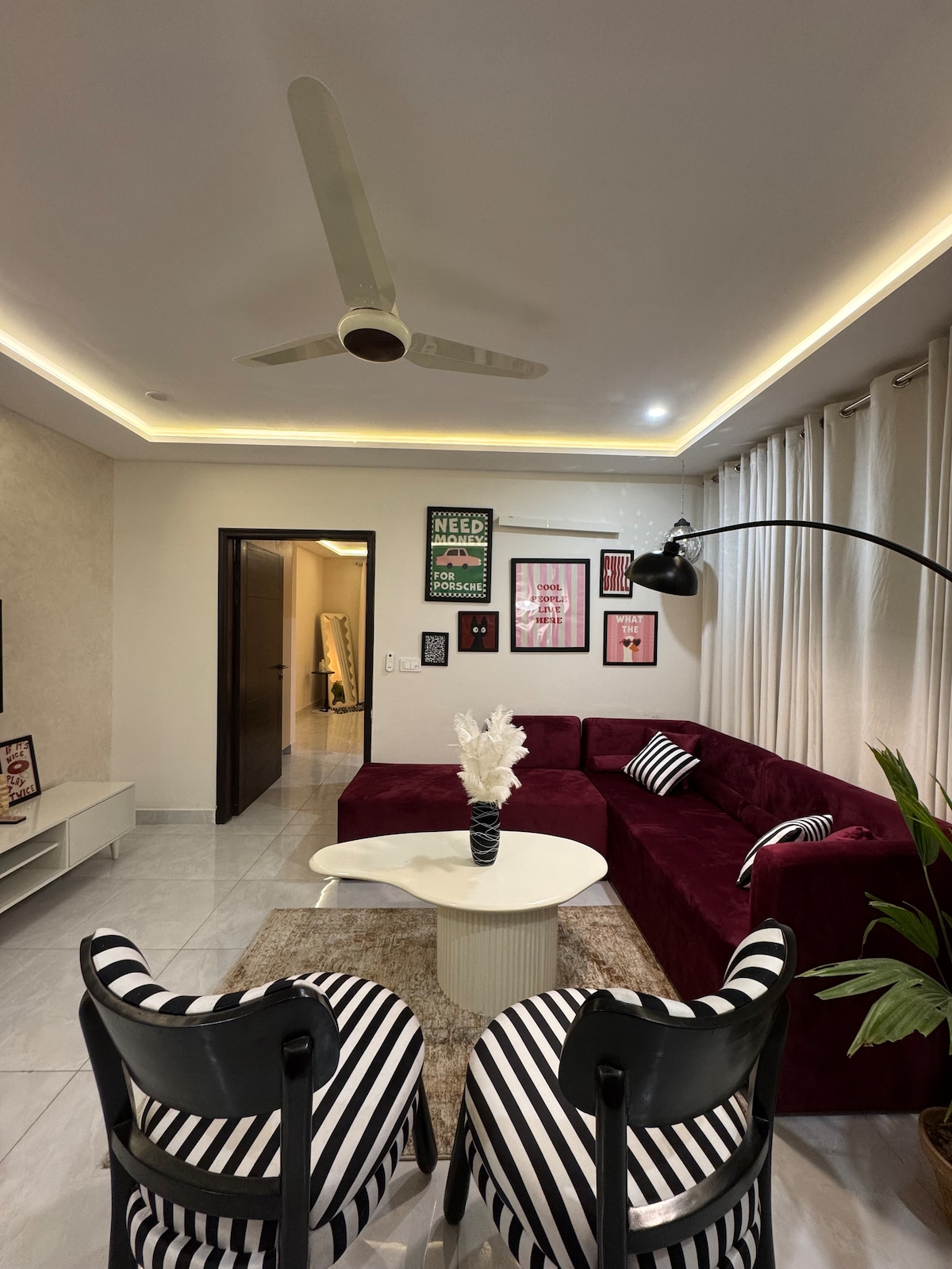 Experience designer living at Luniq, just steps from MM Alam Road the heart of Lahore’s cafes, boutiques, and nightlife. • 🛋️ Aesthetic lounge with cozy rugs, hanging lamp & full-length curtains • 🛏️ Plush king-size bed with premium bedding & city views • 55” Android Smart TV with Netflix & YouTube Premium • 🍳 Fully equipped modern kitchen with essentials • ⚡ Fast Wi-Fi for work or streaming • 🔑 Seamless self check-in for complete privacy • 🌆 Prime Gulberg location