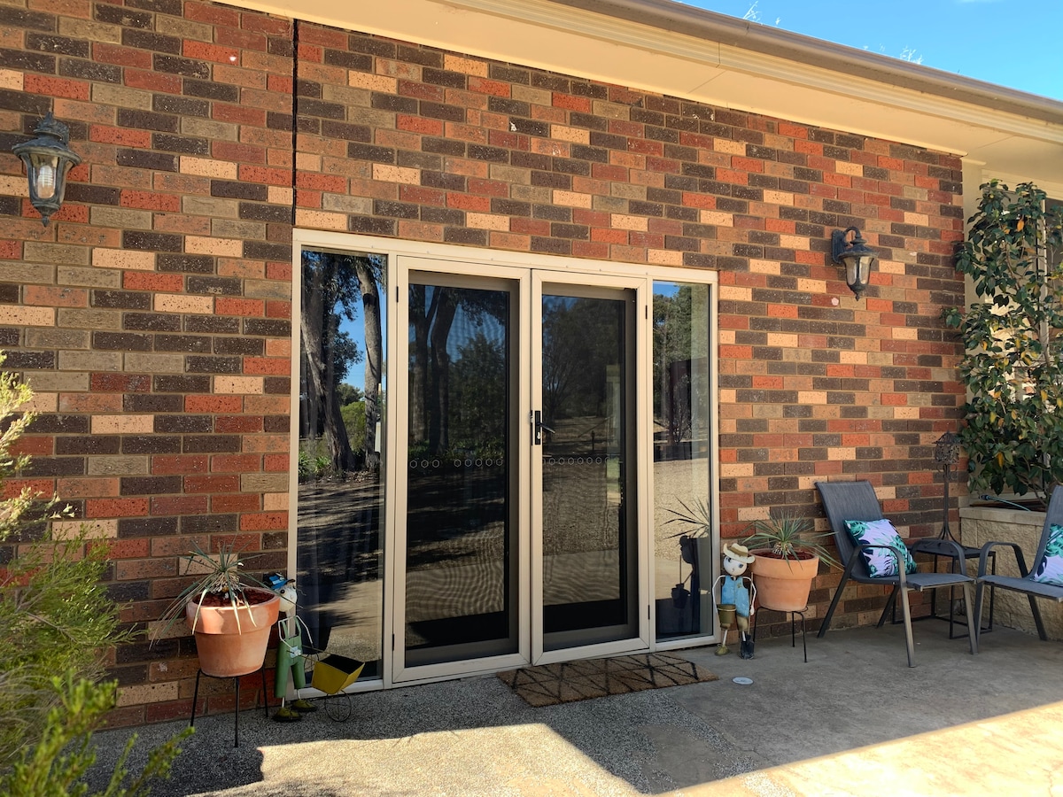 Our guests enjoy a comfortable, peaceful, super-clean studio, easy parking and stunning country views. * King-sized bed (luxury Moss River linen) * Bathroom (shower, vanity, WC) * Reverse cycle air-con, ceiling fan * Kitchenette (fridge, toaster, microwave, induction cooktop, kettle, saucepans, crockery, cutlery) * Shelving & hanging space for clothes * Ironing facilities and WM access * Patio, outdoor setting, gas BBQ * Off-street parking * Lounge, TV, table/desk * Wi-Fi (Telstra NBN Wireless)