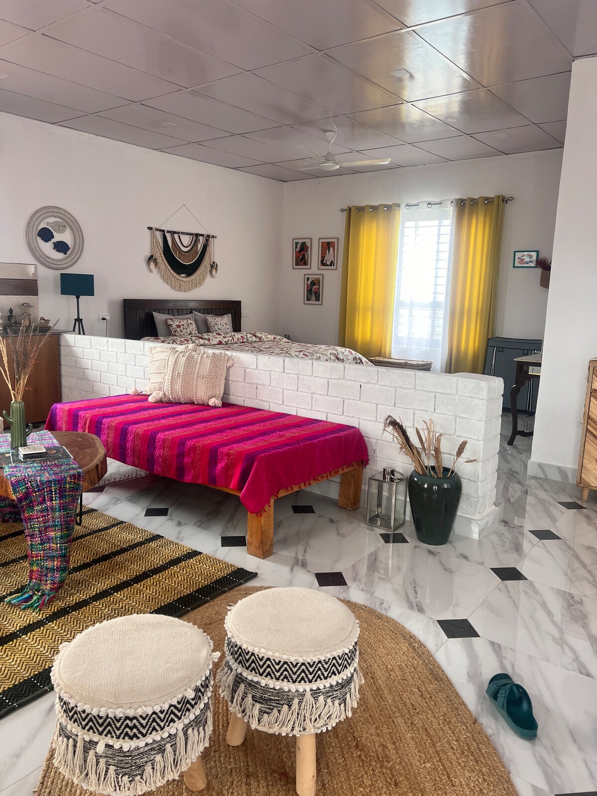 Piękna willa w stylu boho z pięknym widokiem na góry. Jest to przestronny apartament typu studio z jednym podwójnym łóżkiem, jednym pojedynczym, aneksem kuchennym i łazienką. Wnętrza Villa Wildflower sprawią, że zakochasz się w tym miejscu bardziej, ponieważ zostało całkowicie wykonane z miłością. • 500 metrów od głównej drogi targowej Bir na drodze Zostel • Kawiarnie i klasztory są w odległości kilku kroków. • Instytut Deer Park jest jedną z najbliższych atrakcji z nieruchomości.