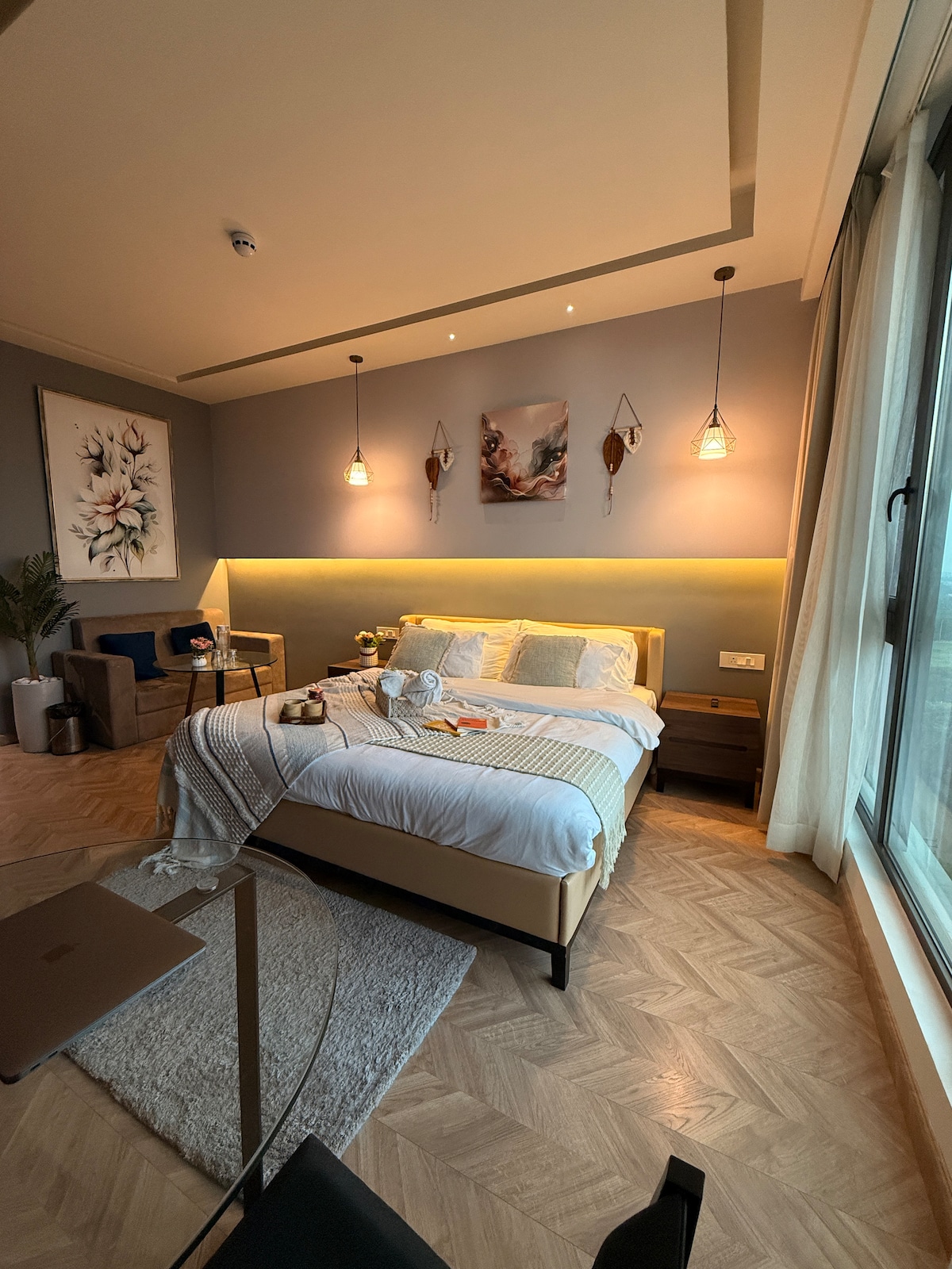 Witamy w naszej przestrzeni w Gurgaon (10 minut od Golf Course Ext Road), gdzie ciepłe odcienie i miękkie tekstury tworzą kojący ucieczkę. Zaprojektowane dla rodzin, osób podróżujących w pojedynkę i par szukających idealnego połączenia wygody i elegancji. Zanurz się w pobliskich restauracjach i ciesz się wygodą bezproblemowej łączności dzięki szybkiemu metru Sector 55-56 Gurgaon i metru Huda City Centre